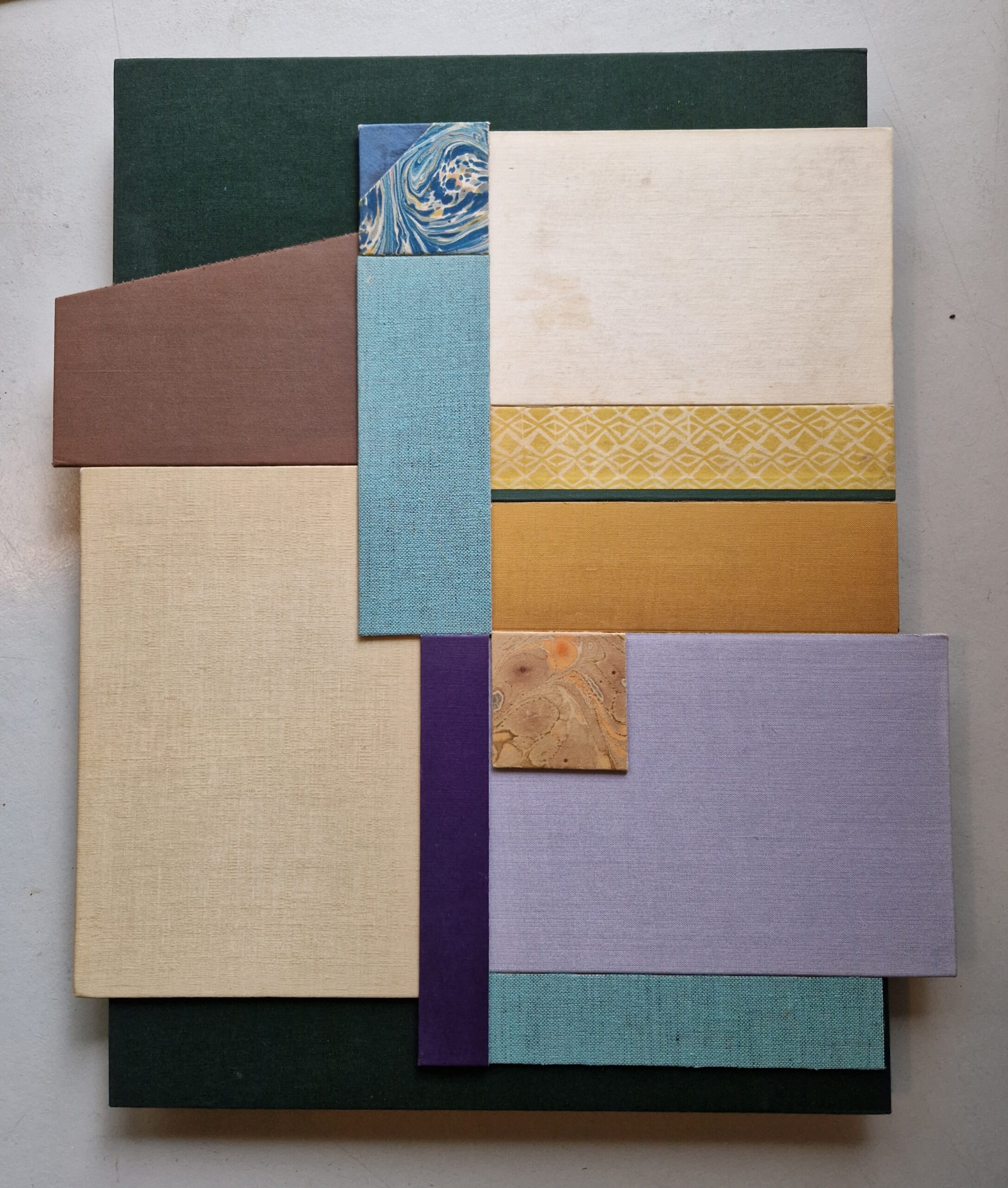 Jag arbetar med betong, papper, textil mm. Motivationen är själva görandet, att komma in i en kreativ process bortom tid och rum. Den senaste tiden har jag arbetat med collage av gamla bokpärmar.