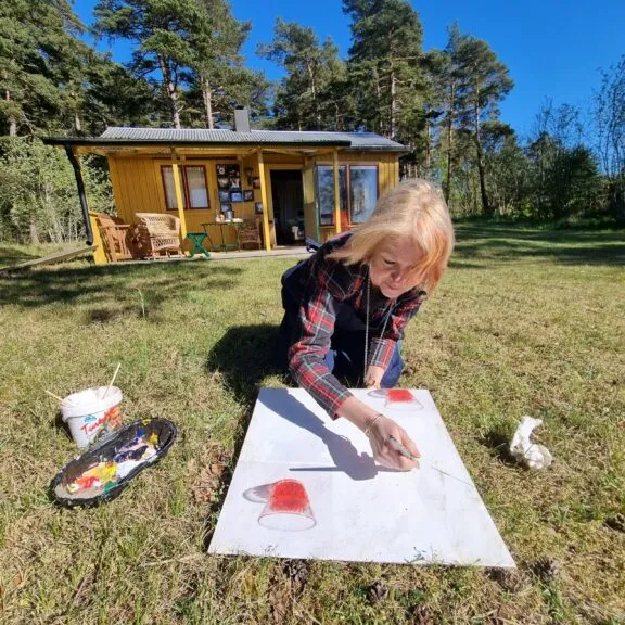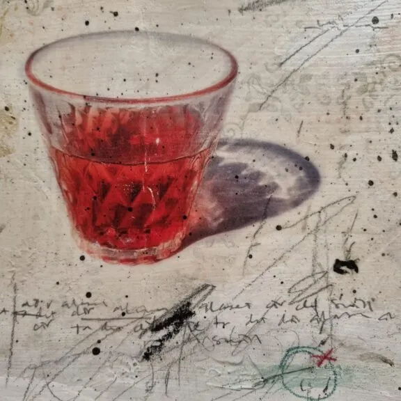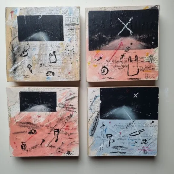 Jag blandar gärna tekniker. Hittar jag material som har patina använder jag det som grund. Inspireras av stämningar och vardagliga ting som bildar stilleben.
